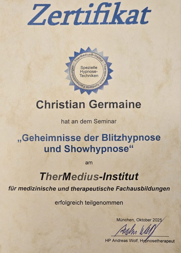 3.) Hypnosesitzung: Dauer ca. 1 1/2 Stunden, Euro 150. Folgetermin(e) Euro 120.